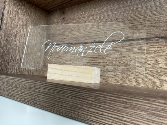Cedulka z čirého plexiskla o velikosti 25x10 cm s nápisem Novomanželé. Styl a barvu písma můžete zvolit podle nabídky.