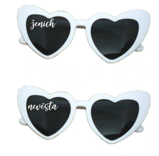 Vinylová samolepka, kterou si ozdobíte sluneční brýle na svatbě . Samolepka je uzpůsobena na délku max. 3 cm. Set obsahuje nápis nevěsta a ženich.